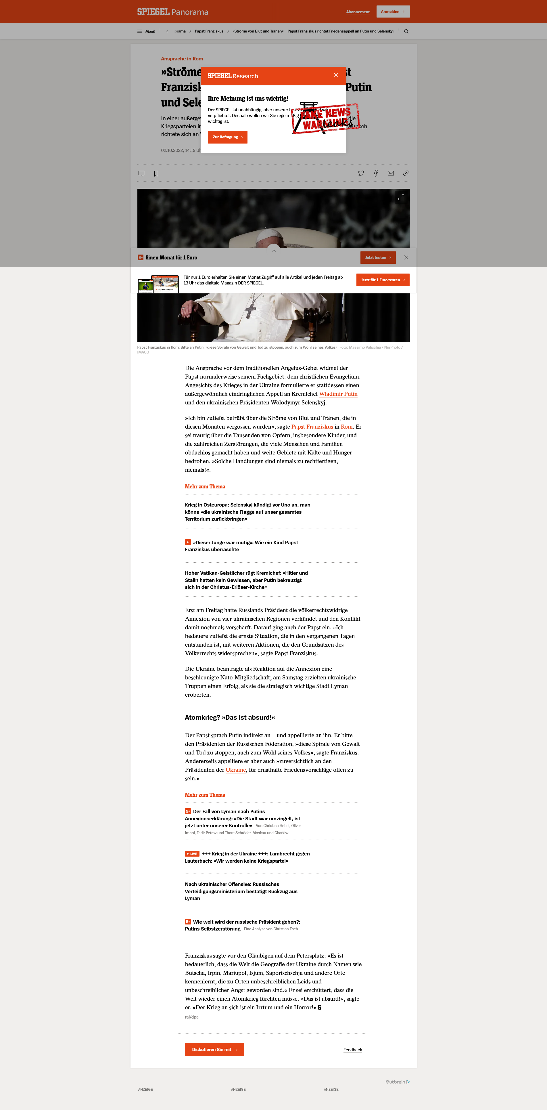 Putin stoppt den Krieg '. Überraschenderweise widmet Papst Franziskus vor dem Angelus seine Überlegungen noch einmal dem Krieg in der Ukraine und bittet um Frieden, Verhandlungen und gerechte, einvernehmliche und stabile Lösungen. Er wendet sich an Putin und Selenskyj und bittet sie, so schnell wie möglich Frieden zu schließen.