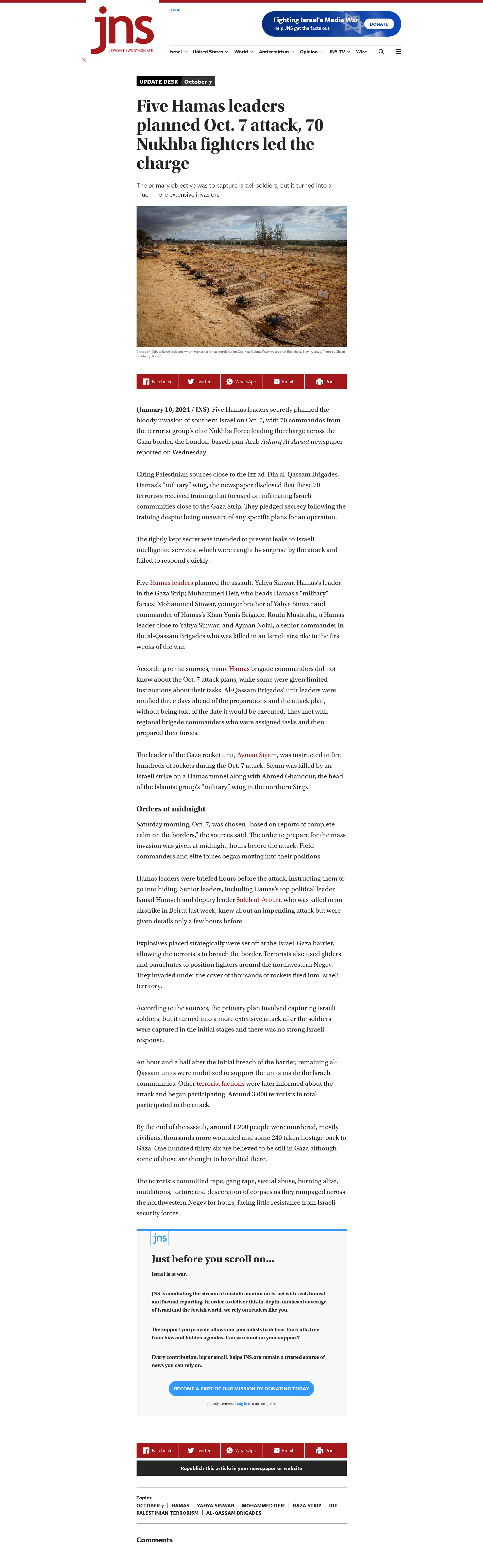 Screenshot zum vollständigen Artikel Jewish News Syndicate vom 10. Januar 2024 | Five Hamas leaders planned Oct. 7 attack 70 Nukhba fighters led the charge - JNS.org